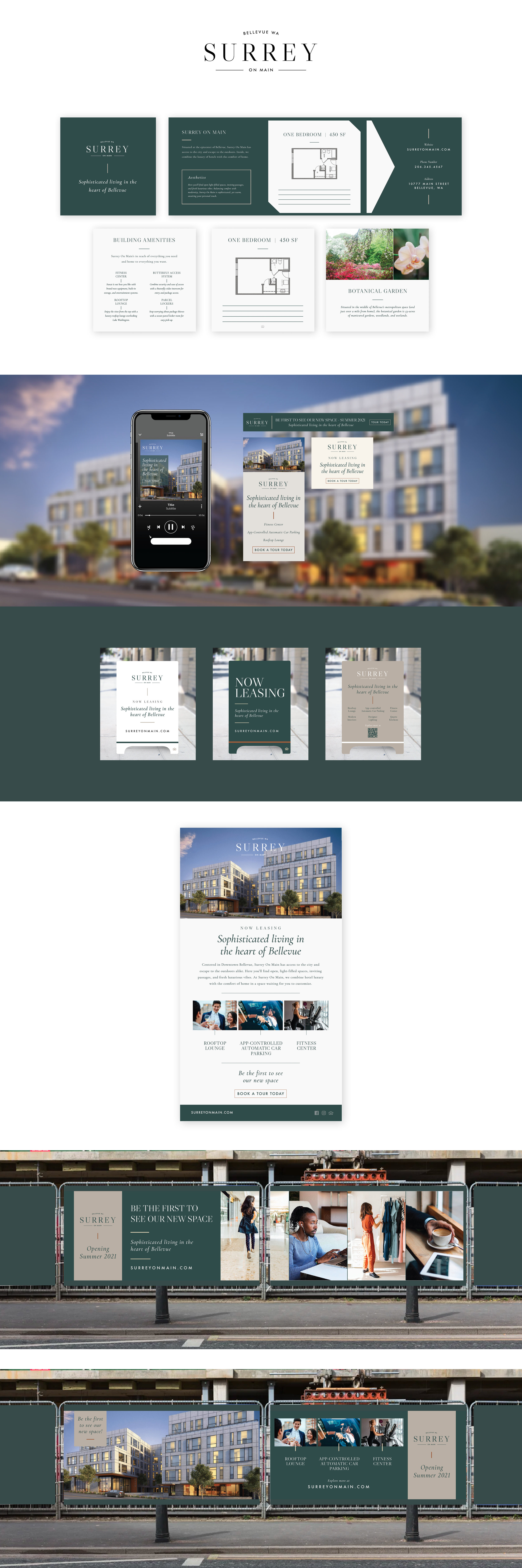 We were engaged to do the preliminary brand development for Surrey on Main, located in Bellevue, WA. This project is sophisticated, elevated, and modern so we wanted the brand to reflect that. We chose a color palette that paired well with the interior colors and textures while remaining mature and elegant.