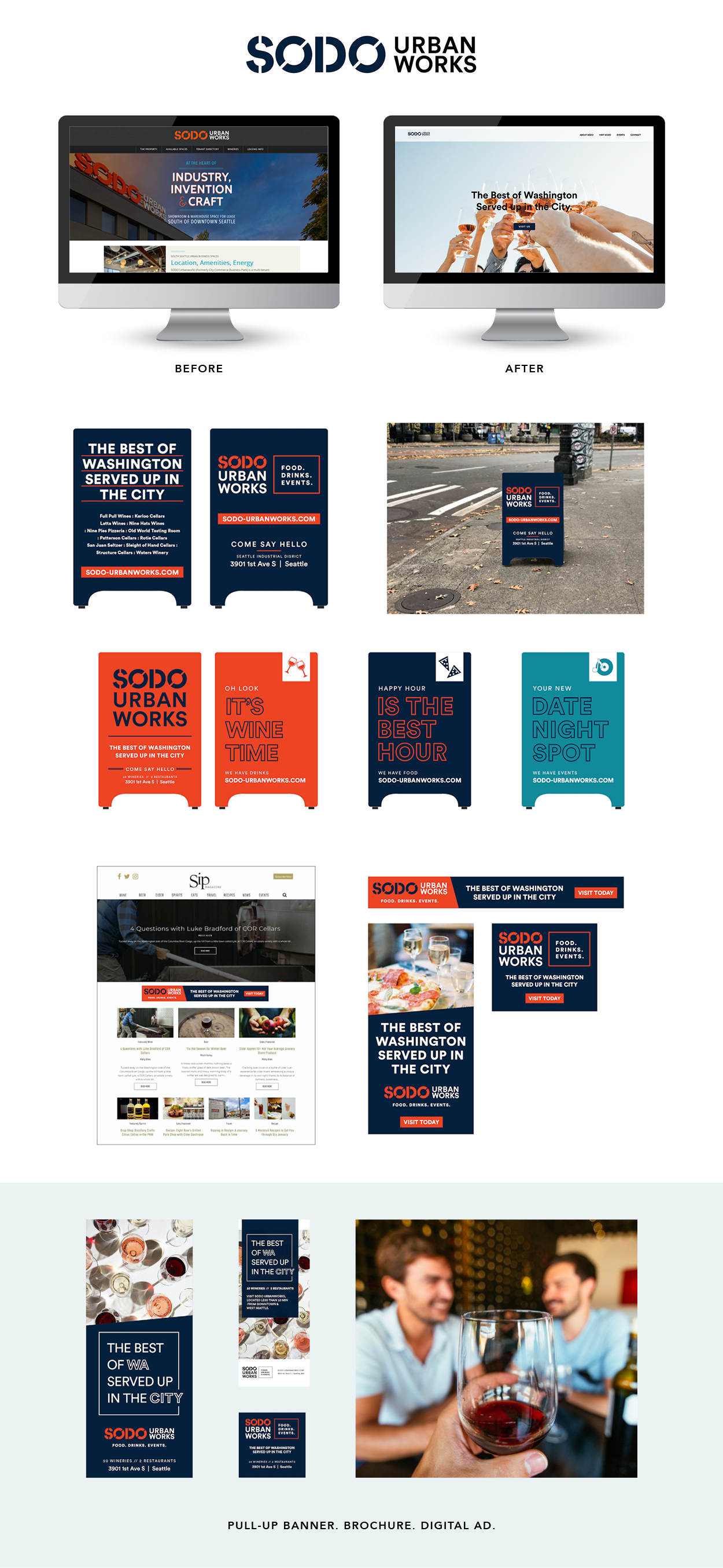 The collateral and signage that followed was a way to enhance the personality of SODO through our reimagined voice and tone while reestablishing our brand presence, this time as a destination for families, dogs, and wine lovers.